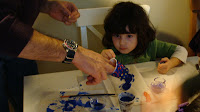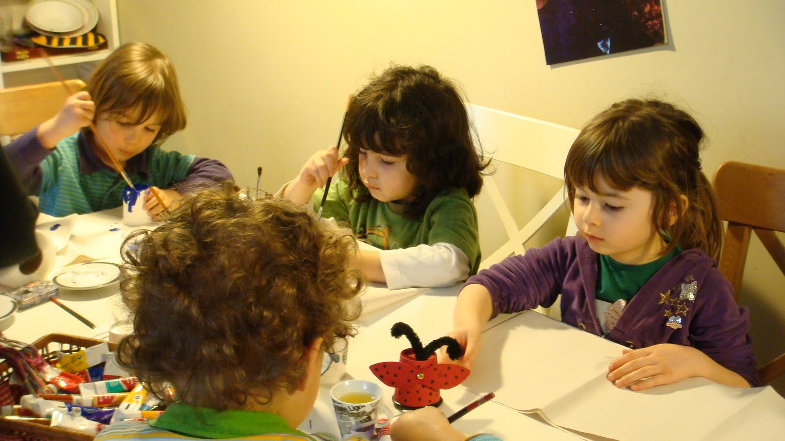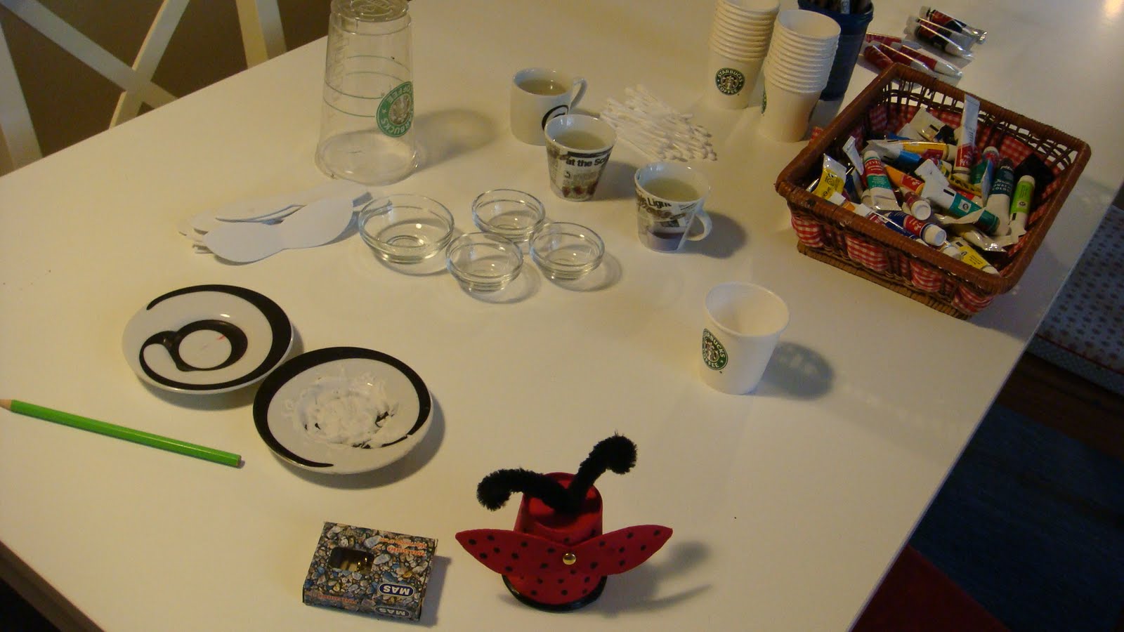 Kıpırdanmalar başlayınca doğru aktivite masasına. Ayşe onlara Starbucks espresso bardaklarından uğurböcekleri yaptırttı. Babaları da davet etti masaya ama onlar geri planda kalmayı tercih ettiler nedense…